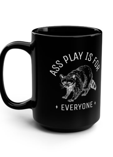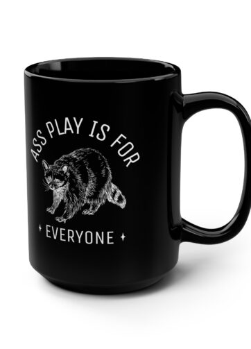 These black mugs come in one size – 15oz (0.44l) – plenty for morning caffeine boosts and hot cups of tea on a rainy day. They’re easy to grip and feel sturdy thanks to the C-shaped handle. .: Black ceramic material with a glossy finish .: One size: 15oz (0.44