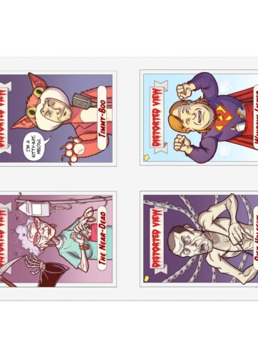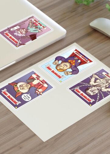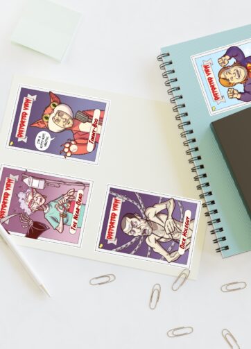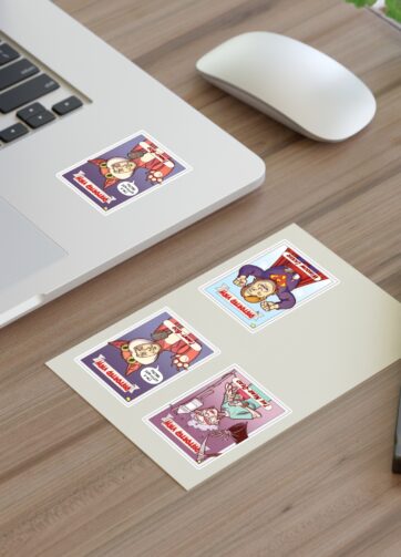 All four characters from the limited edition trading cards now available in sticker pack. Sticker sheet comes in two available sizes.
