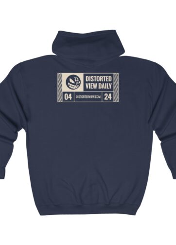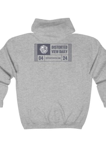 Back of hoodie features Distorted View design and year of the podcast run to date: ’04 – ’24.